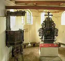 Bei der Kanzel fallen die gedrehten Säulen ins Auge.