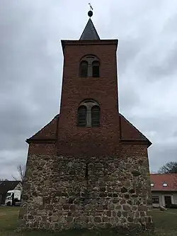 Der Turm nimmt die volle Breite des Kirchenschiffs auf. An der Nord-, West- und Südseite ist im Erdgeschoss je eine hochgesetzte, hochrechteckige Öffnung. An der Südseite ist zusätzlich eine Pforte; darüber ein Ziegel mit der Jahreszahl 1716. An der Westwand sind in Höhe der Mauerkrone großflächige Ausbesserungsarbeiten aus Mauerstein erkennbar. Darüber erstreckt sich das Turmgeschoss. Es besteht an der Westseite aus Mauerstein; dort sind zwei übereinander angeordnete Rundbogenöffnungen, in die je zwei gekuppelte Klangarkaden eingebaut wurden. Die Nord-, Ost- und Südwand bestehen aus Fachwerk mit je zwei rechteckigen Klangarkaden an der Nord- und Südseite sowie einer Klangarkade an der Ostseite. Oberhalb ist ein Spitzhelm mit Turmkugel und Wetterfahne und Kreuz.