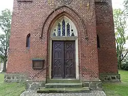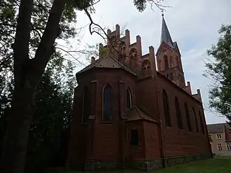 Das Bauwerk wurde im Wesentlichen aus rötlichem Backstein auf einem schmalen Sockel aus ungeschichteten und nur wenig behauenen Feldsteinen errichtet. Der Chor ist stark eingezogen und hat einen Fünfachtelschluss. An jeder Seite ist ein schmales, hochgesetztes Lanzettfenster, dazwischen je ein zweifach gestufter Strebepfeiler. Am Übergang zum Kirchenschiff ist an beiden Seiten je ein kleiner, rechteckiger Anbau. Der Giebel ist reichhaltig mit sieben gestaffelten, spitzbogenförmigen Blenden verziert. In jedem Bogen sind zwei weitere gekuppelte Bögen mit einer darüberliegenden Kreisblende.