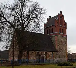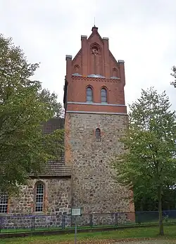 Die Kirche wurde als Saalkirche mit Rechteckchor in der Mitte des 13. Jahrhunderts aus Feldsteinen errichtet. Im 15. Jahrhundert wurde der etwas schmalere spätgotische Westturm aus unbehauenen Feldsteinen mit Backsteinkanten hinzugefügt. Das Westportal hat einen Spitzbogen mit Backsteingewände. Im Süden findet sich ein vermauertes Spitzbogenportal. Das barocke Nordportal dürfte aus einem Umbau im 18. Jahrhundert stammen. Dabei wurden die Fenster korbbogig vergrößert. Das neugotische Glockengeschoss aus Backstein mit seitlichen Blendengiebeln stammt aus der zweiten Hälfte des 19. Jahrhunderts.