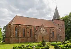 Der einschiffige Backsteinbau aus dem 15. Jahrhundert besteht aus dem gestreckten fünfjochigen Schiff mit einem 5/8-Chorschluss und einem massigen vorgesetzten Westturm. Noch im Mittelalter sind an der Südseite die westlichen drei Joche durch in Dorfkirchen seltene Seitenkapellen erweitert worden. An der Nordvorhalle entstand etwa gleichzeitig ein Anbau mit einem Blendgiebel.