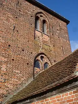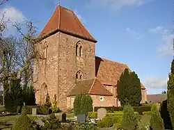 Der um 1500 angebaute zweigeschossige quadratische Westturm ist mit einem Pyramidendach und Biberschwanzziegeln versehen. Auf der westlichen Spitze des Dachfirsts steht über der Kugel ein vergoldetes Kreuz. Die zweiteiligen eingerückten Spitzbogenfenster unter den Überfangungsbögen der Turmseiten wurden oberhalb als Schmuckelement noch mit einem Oculus als blindem Rundfenster ausgestattet. Die Laibungen des hohen spitzbogigen Eingangsportals sind mit einer dekorativen Gewändeprofilierung gestaltet worden.