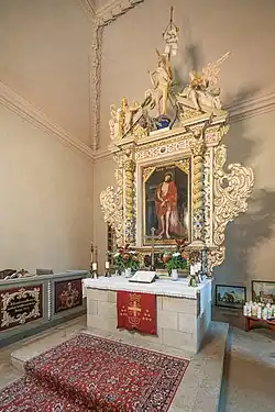 Das Altarretabel von 1684 besteht in seiner Predella aus der Darstellung des Abendmahls Jesu und ist ein Werk, das F. Lutherus ein Jahr zuvor schuf. Das Bildnis wurde in Anlehnung an den Altar in der Stadtkirche Lutherstadt Wittenberg derart umgestaltet, dass auf dem Bild sowohl Martin Luther wie auch der Stifter, Hans Georg III. abgebildet sind. Oberhalb ist ein Gemälde des Ecce Homo, das Cl. Hertzog schuf. Es handelt sich um die einzige Darstellung dieser Art in einem Brandenburgischen Altarretabel. Es wird von gewundenen Säulen umrahmt, die mit einer abstrahierenden Tulpendarstellung geschmückt ist. An ihren Sockeln ist das Stifterwappen sowie das Datum zu finden. Seitlich sind mit Knorpelwerk verzierte Wangen angebracht. Oberhalb ist im gesprengten Giebel der auferstandene Christus zu sehen, vermutlich ein Werk des Balthasar Permoser, was Andreas Kalesse mit der ungewöhnlichen Qualität begründet. Seitlich sind Engel angebracht. Die Kanzel aus der Zeit um 1640 wurde in den Jahren 1680/1681 umgestaltet, verkürzt und mit einem neuen Schalldeckel versehen, oberhalb ist eine Taube als Zeichen für den Heiligen Geist. Dort ist die Inschrift zu lesen: „Ruffe getrost, schone nicht, erhebe deine Stim, wie eine Posaune, und verkündige meinen Volck ir übertreten, und dem Hause Jacob ire Sünde. Jes. 58“. Am polygonalen Korb sind die Gemälde der Evangelisten zu sehen, an der Rückwand der Salvator mundi. Die hölzerne Fünte stammt aus den Jahren 1680/1685 und besitzt eine achtseitige Kuppa, die mit Fruchtgehängen verziert ist. Sie steht auf einem Fuß und besitzt einen hohen, tulpenförmigen Deckel.