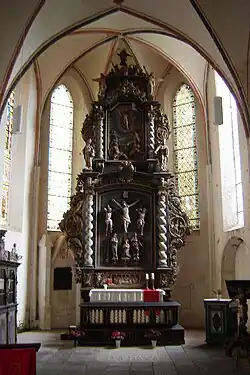 Die dreischiffige EmporenHalle mit Polygonchor, südlicher Sakristei und einer südlichen Vorhalle wurde in der zweiten Hälfte des 13. Jahrhunderts errichtet. Der breitere Westbau besitzt unter dem Pyramidendach einen unvollendeten Mittelturm. Am Kirchenschiff befinden sich Reste eines Konsolfrieses.