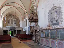 Die Kirche mit ihrem Kreuzrippengewölbe beinhaltet eine qualitätsvolle Barockausstattung. Die Flachdecke der Sakristei trägt eine Rankenbemalung. Im Obergeschoss befindet sich die Patronatsloge. Der Altaraufbau wurde um 1700 von Johannes Wendt aus Stralsund gefertigt. Er weist ein reiches Reliefdekor und Akanthusschnitzwerk auf. Die Kanzel von 1702 stammt ebenfalls von Wendt; sie wird von einer Mosefigur gestützt. Der Korb wird dekoriert mit Szenen aus der Geschichte Christi und der Evangelisten, der Schalldeckel ist von einer Madonna bekrönt. Weitere Gegenstände sind das Kruzifix (um 1500), das Sandsteinepitaph von der Osten (1613) mit Marmorrelief der Auferstehung und Figuren des Verstorbenen. Der Beichtstuhl stammt von 1763. Die Chorfenster wurden 1894 vom Königlichen Institut für Glasmalerei Berlin gefertigt.