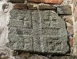 In Grunow befinden sich sechs grüne, blaue und rote Schachbrettsteine, darunter zwei Ecksteine, an der Nordwestecke der Kirche in der von unten fünften, sechsten und siebten (sichtbaren) Feldsteinlage. Ein weiterer Stein liegt in der Chor-Nordwand über der zugemauerten Pforte. Der Jerusalemstein verziert die Westseite des nördlichen Stützpfeilers. Da er sich neben dem zerstörten Westportal befindet, geht Matthias Friske davon aus, dass der Stein ursprünglich über dem für feierliche Anlässe genutzten Westeingang saß. Zumindest dieser Stein wurde also sekundär verbaut.[12] Das Jerusalemkreuz, Zeichen des Ritterordens vom Heiligen Grab zu Jerusalem und heute beispielsweise auch als Logo des Deutschen Evangelischen Kirchentags verwendet, ist ein gemeines beziehungsweise griechisches Kreuz, bei dem in den vier Quadranten nochmals jeweils ein kleineres griechisches Kreuz angeordnet ist. Die fünf Kreuze symbolisieren Christus und die vier Evangelisten oder die fünf Wunden Christi.