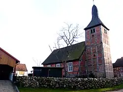 Die 1712 erneuerte Fachwerkkirche, deren Gefache mit Backsteinen ausgefüllt sind, geht im Kern auf einen Vorgängerbau aus dem Jahr 1591 zurück. Sie besteht aus einem Langhaus, das mit einem Satteldach bedeckt ist, und einem quadratischen Kirchturm im Westen, dessen oberstes Geschoss hinter den als Biforien gestalteten Klangarkaden den Glockenstuhl beherbergt, und auf dem ein achtseitiger, schiefergedeckter Knickhelm aus dem Jahr 1905 sitzt.