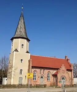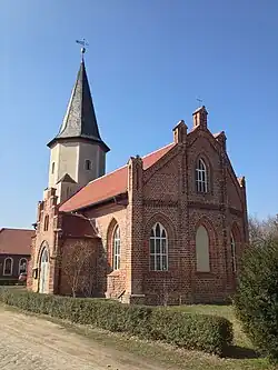 Die erste Dorfkirche erhielt das Dorf Hänchen im 14. Jahrhundert, diese war eine Filialkirche von Groß Gaglow.[1] Im Jahr 1743 erhielt der Turm ein datiertes Glockengeschoss und einen achteckigen Spitzhelm. 1867 wurde die alte Dorfkirche bis auf den Turm abgerissen und das Kirchenschiff neu gebaut. Diese bis heute erhaltene Kirche ist ein Saalbau aus Backstein mit einer dreiseitigen und durch Pfeiler gegliederten Ostfront. Sie weist Stile der Neugotik auf.[2] An der Südwand befindet sich eine kleine Vorhalle mit Eingangsportal und einem Stufengiebel. Im Inneren hat die Kirche eine Westempore.[3]