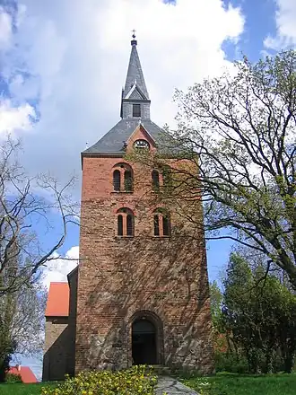 Der kreuzförmige Apsissaal wurde 1874 zur Jahresfeier der Schlacht bei Fehrbellin nach einem Entwurf von Paul Emmanuel Spieker erbaut. Der spätgotische, quadratische Kirchturm im Westen hat im unteren Bereich Anteile von Feldsteinen. Er wurde beim Neubau des Langhauses um ein Geschoss aus Backsteinen aufgestockt und mit einem schiefergedeckten Pyramidenstumpf bedeckt, aus dem sich ein quadratischer Dachreiter erhebt, auf dem ein spitzer Helm sitzt.