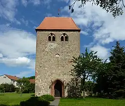 Die 1306 erstmals erwähnte spätgotische Saalkirche aus Feldsteinen besteht aus einem Langhaus, das im Osten halbrund geschlossen ist, und einem querrechteckigen Kirchturm von 1495, dessen oberstes Geschoss hinter den Klangarkaden den Glockenstuhl beherbergt, und der mit einem Walmdach bedeckt ist. Im Inneren befindet sich ein Kanzelaltar von 1700.[1] Beim neogotischen Umbau 1900 wurden die Fenster vergrößert und das Langhaus erhöht.