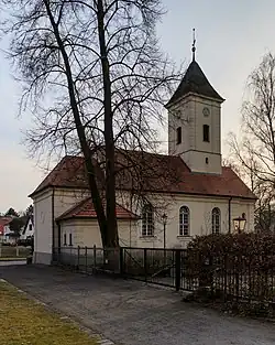 Der Neubau von 1756 hatte einen hölzernen Dachturm mit viereckiger Laterne, geschweifter Haube und mehrteiliger Spitze. Auch der Turm der Kirche von 1830 saß als Reiter auf dem Satteldach des Kirchenschiffes. Der durch Hausschwamm baufällig gewordene Turm wurde 1960 durch einen massiven Neubau in alter Form erneuert. In ihm hängen drei Bronzeglocken.