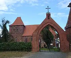 Um die auf einer Anhöhe stehenden Kirche befindet sich der Friedhof. Er wird durch eine Mauer umgeben und der Zugang erfolgt auf der südlichen Seite durch ein imposantes Kirchhofstor. Bei einem starken Sturm war es am 12. Februar 1894 umgestürzt. Die beiden Figuren der heiligen Maria mit dem Kinde und des heiligen Nikolaus mit seinem Hirtenstab aus gebranntem und glasierten Ton auf dem Torbogen befinden sich auch an der Kirche St. Nikolai in Wismar.