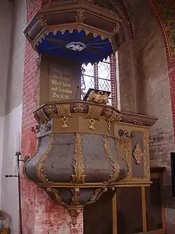Schon um 1573 hat es eine Kanzel gegeben, denn in den Chronikaufzeichnungen von Pastor Crull ist 1731 zu lesen: „durch den Fleiß von Pastor Role wurde 1573 die Kirche innwendig mit Stühlen vermehret, die alte Kanzel samt der Orgel renovieret“.[4] Die Holzkanzel an einem Nordpfeiler wurde 1739 vom Bildhauer Heinrich Johann Bülle mit reichlichen Figurenschmuck gefertigt. Das Lesepult wird von einem kleinen geschnitzten Pelikan mit seinem Jungen getragen. Um 1900 wurden die Engel mit dem Kreuz, die Tauben, der Kelch, die Bibel sowie der hölzerne Wolkenkranz abgebaut.