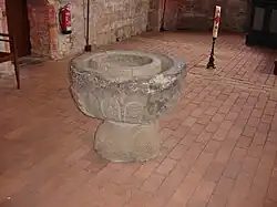Die frühromanische Granitfünte steht seit 1955 im Altarraum mit Spuren von eisernen Haken zur Befestigung des Deckels.[11] Die Herstellungszeit liegt vor 1160, was auch die raue Oberfläche durch die Stein-auf-Stein-Klopftechnik bezeugt. Sie ist mit reichem figürlichen Schmuck sowohl am Fuß als auch an der Kuppa versehen. Zwölf Tore in vier Dreiergruppen weisen auf das himmlische Jerusalem hin. Dazwischen sind vier Zöpfe mit Schleifen am oberen Ende zu sehen, die den Taufstein schmücken. Am Fuß der Fünte sind vier Profilköpfe zu sehen. In der Taufschale befindet sich ein Weihwasserbecken aus gleicher Zeit. Die Fünte ist 83 cm hoch, 96 cm breit, hat eine Kuppahöhe von 47 cm und eine Wandstärke von 11 bis 12 cm.[12]