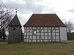 Das steile Dach ist mit handgestrichenen Biberschwanzziegeln eingedeckt. Anders als üblich steht der freistehende Kirchturm nicht im Westen, sondern im Südosten des Gebäudes. Er ist verbrettert und trägt ein überstehendes Pyramidendach, auf dessen Kupferspitze die Wetterfahne mit der Jahreszahl 1732 zu sehen ist.