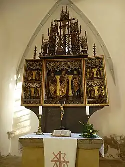 Der Chor hat ein spätgotisches Netzrippengewölbe, der Triumphbogen wird noch der Romanik zugeordnet.