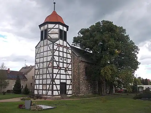Hier ist das in seiner heutigen Form in der Mitte des 19. Jahrhunderts entstandene Bauwerk mit einem Friedhof in der Ortsmitte zu finden. Es wird baulich dem Rundbogenstil der Berliner Schule zugeordnet. Ein bemerkenswertes Ausstattungsstück der Kirche ist eine zur Taufe umgearbeitete mittelalterliche Glocke.[2][3]