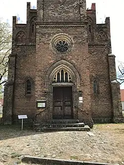 Das Bauwerk wurde im Wesentlichen aus Mauersteinen auf einem umlaufenden Sockel aus Feldstein errichtet. Der Chor ist stark eingezogen und hat einen Fünfachtelschluss. In jedem Feld ist ein hohes, zweifach profiliertes Spitzbogenfenster, dazwischen zweifach getreppte Strebepfeiler. Seitlich sind zwei Anbauten mit je einem spitzbogenförmigen Fenster nach Osten und einem weiteren Strebepfeiler an den Ecken. Am Übergang zum Dach ist eine umlaufende Voute. Der Staffelgiebel ist durch einen nach unten geöffneten Fries vom Chor abgetrennt. Er ist in sieben Segmente unterteilt, die mit Fialen verziert sind. Darin sind spitzbogenförmige Blenden, in die jeweils wiederum zwei spitzbogenförmige Blenden eingelassen wurden, darüber jeweils eine kreisförmige Blende.