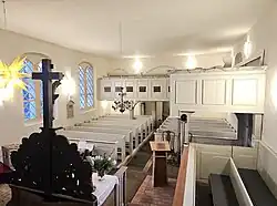 Das verputzte Langhaus der Saalkirche wurde 1678 erbaut. Der eingezogene Anbau im Osten in der Art eines Chores und der verbretterte, mit einem Pyramidendach bedeckte Dachturm, der ist sich im Westen aus dem Satteldach des Langhauses erhebt, entstanden 1824. Die Turmuhr befindet sich im Pyramidendach. Im Glockenstuhl hängen zwei spätmittelalterliche Kirchenglocken. Der Innenraum ist geprägt von der Renovierung 1954/55. Die Orgel mit 7 Registern auf einem Manual und Pedal wurde 1957 von Alexander Schuke Potsdam Orgelbau hinter den Prospekt der 1723 von David Baumann gebauten Orgel gebaut.[1]