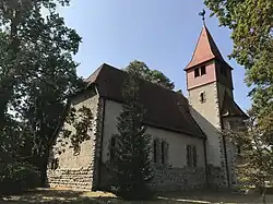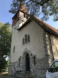 Die Kirche kann über ein großes Rundbogenportal von Westen her betreten werden. Seitlich sind je zwei kleine hochrechteckige Fenster. Oberhalb des Portals sind drei kleine Rundbogenfenster, von denen das mittlere überhöht ist. Der Kirchturm wurde ausmittig nach Nordwesten angebaut. An der Westseite ist ein kleines Rechteckfenster. Nach Norden hin ist ein fünfeckiger Turm angebaut, der als Treppenaufgang dient. Er ist gänzlich aus behauenen Steinen errichtet. Im oberen Geschoss ist an der West- und Südseite je eine Turmuhr. Darüber ist ein verschiefertes Glockengeschoss mit je zwei rechteckigen Klangarkaden an jeder Seite. Es folgt ein geknicktes Pyramidendach, das mit Turmkugel und Wetterhahn abschließt.