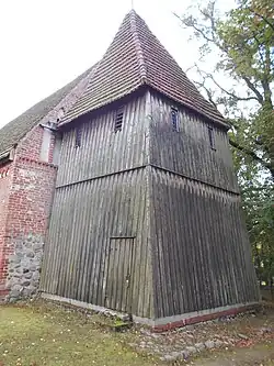 Der erste hölzerne Turm soll 1690 errichtet worden sein, doch schon für die älteste Glocke aus dem Jahre 1450 hatte es einen hölzernen Glockenstuhl gegeben.[10]
