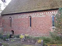 Die Dorfkirche ist eine Saalkirche mit rechteckigem Grundriss aus Backstein und geht auf die Zeit um 1270/80 zurück. An der Ostwand befinden sich unter dem Blendengiebel mit dem Kreuz und den Schmuckfriesen mittig eine Dreifenstergruppe mit schmalen Spitzbogenfenstern und Blenden an den Längsseiten. Als dekoratives Horizontalband befinden sich im Gesimsbereich umlaufend ein Zahnfries als Deutsches Band und darunter ein Spitzbogenfries. Im Süden ist ein Spitzbogenportal mit gekapptem Blendengiebel angeordnet.[9] Auf mehrfache Planwechsel deuten das zugesetzte Westportal, die beiden nachträglich angesetzten und abgetreppten Stützpfeiler und Schildbögen einer anfangs nicht vorgesehenen und nicht ausgeführten Wölbung in zwei Jochen.[9]