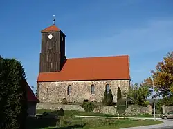 Die Kirche ist ein flachgedecktes rechteckiges Bauwerk aus Feldstein auf geschrägtem Sockel mit gleichbreitem Westturm aus der zweiten Hälfte des 13. Jahrhunderts. Der verbretterte quadratische Turmaufsatz ist mit einem Zeltdach von 1742 gedeckt, das in den Jahren 1956/1957 erneuert wurde, die Nordvorhalle stammt aus dem Jahr 1872. Im Süden erschließt ein großes vermauertes Spitzbogenportal das Bauwerk, in der nördlichen Turmwand findet sich eine vermauerte Tür zu einer ehemaligen Mauertreppe. Die Rundbogenfenster stammen aus dem 18. Jahrhundert, Reste der ursprünglichen Fenster sind noch im Süden zu erkennen, an der Ostwand ist eine große Spitzbogenblende angeordnet (ähnlich wie bei der Dorfkirche Haßleben). Unterhalb des gekehlten steinernen Traufgesimses der Südwand ist ein Putzritzfries mit gemaltem Blattornament (unter anderem mit Lilien, ehemals in rot, gelb und grau) angeordnet, in den kleine Spitzbogenblenden (ehemals bemalt, ein kleiner Engel erhalten) einschneiden, und der wohl aus der Zeit um 1280 stammt; dazwischen sind Reste des mittelalterlichen Putzes mit einer Bandfuge, welche die Blenden rahmt, erhalten. Innen ist das Bauwerk mit einer Putzdecke auf Voute geschlossen und enthält eine geschwungene Westempore des 18. Jahrhunderts. Turm und Schiff sind nur durch eine Spitzbogentür verbunden; in die Ostwand ist eine kleine Sakramentsnische eingelassen.