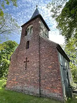 Die Westwand ist fensterlos und wurde aus rötlichen Mauersteinen errichtet. Mittig tritt ein breiter, gemauerter Streifen hervor, in den ein Kreuz eingelassen wurde. Darüber ist im Giebel ein rundbogenförmiges Fenster. Darüber erhebt sich der Westturm, der einen quadratischen Grundriss besitzt. Die Westwand ist vermauert und besitzt im Glockengeschoss eine rundbogenförmige Blende, in der zwei gekuppelte Klangarkaden eingelassen sind. An der Süd- und Ostseite, die aus Gefach besteht, ist je ein ausmittig angebrachtes Ochsenauge; die Nordwand ist fensterlos. Darüber erhebt sich der geknickte Turmhelm, der mit Turmkugel und Wetterfahne abschließt.