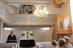 - Kanzel aus der Rokokozeit mit Grisaille-Malerei der vier Evangelisten auf einem Gemälde mit blauen Grund; 2017 restauriert