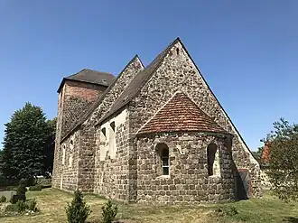 Der querrechteckige Westturm weist keine Baunaht auf und dürfte damit ebenfalls aus der Bauzeit stammen. Er nimmt die Breite des Kirchenschiffs auf und ist 6,3 m lang. Im Westen sind zwei mächtige, moderne und aus Mauersteinen errichtete Strebepfeiler, die bis in das Glockengeschoss reichen; dazwischen eine Rundbogenpforte. Oberhalb des aus Feldsteinen errichteten Eingangsbereichs sind drei übereinander angeordnete Rundbogen erkennbar (Ausbesserungsarbeiten?); oberhalb eine rundbogenförmige Öffnung. An der Nordseite ist ein kleines Fenster, das aus der Bauzeit stammen dürfte; gleiches gilt für die Südseite. Im mittleren Geschoss ist eine hochrechteckige Öffnung. Darüber wie auch an der Nordseite ebenfalls eine rundbogenförmige Öffnung. Im Glockengeschoss wurden ausschließlich Mauersteine verwendet. Es schließt mit einem quergestellten Walmdach ab.