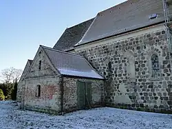 Die Chorfenster sind in Dreiergruppen angeordnet, an der Ostseite unter einer spitzbogigen Blende mit einem darüber angeordneten Giebel mit Blendenschmuck und vertieftem Kreuz. Auf der Nordseite wurde um 1760 eine gewölbte Gruft angebaut. Der Westturm wurde 1780 dem Schiff in gleicher Breite vorgesetzt und mit einem achteckigen Fachwerkaufsatz mit Haube und Laterne bekrönt. Im Jahr 2010 wurde nach einer Sicherung die barocke Erstfassung dieses Bauteils wiederhergestellt. In den Jahren 2007/2008 wurde nach Einsturzgefahr des Gurtbogens im Schiff eine Gewölbe- und Dachsanierung durchgeführt.[1] Danach fand eine Innenrestaurierung in den Jahren 2013 bis 2014 statt.[2]