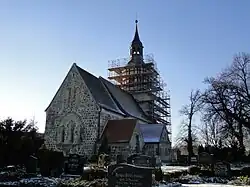 Die stattliche Feldsteinkirche steht auf dem Anger des Dorfes und wurde im letzten Viertel des 13. Jahrhunderts erbaut. Sie besteht aus einem rechteckigen, ursprünglich flachgedeckten Schiff, das mit gebusten Kreuzrippengewölben in zwei Jochen abgeschlossen ist, und einem eingezogenen Chor mit kuppelartigem Kreuzrippengewölbe und einer nördlich gelegenen Sakristei mit Tonnengewölbe. Die Dächer stammen aus dem 18. Jahrhundert.