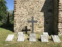 An der Südseite des Kirchturms sind mehrere Grabmäler derer von Manteuffel.