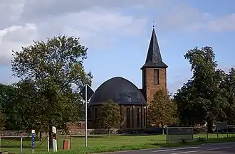 Die jetzige Kirche wurde 1950–1955 nach Plänen des Baurats Curt Steinberg auf dem Friedhof im Nordwesten des Dorfes errichtet, direkt an der B 167.[3] Die früheren Kirchen standen im Dorfzentrum. Der Friedhof wurde im späten 17. Jahrhundert von der Familie Barfus angelegt. Auf diesem Friedhof befindet sich außerdem das Erbbegräbnis der Familie von Lestwitz-Itzenplitz.