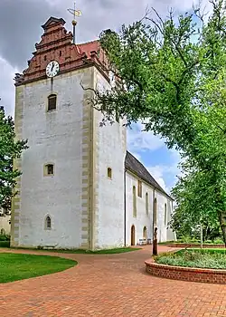 Die Kirche ist ein verputzter Backsteinbau mit geradem Chorschluss und Korbbogenfenstern. Der im Kern ältere Turm ist mit einem Kreuzdach und Volutengiebeln abgeschlossen. Das vermauerte Spitzbogenportal im Westen wurde vermutlich im ersten Viertel des 13. Jahrhunderts angelegt.