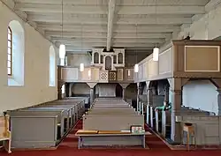 Der barocke Altar entstand in der ersten Hälfte des 18. Jahrhunderts. Er besteht aus gedrehten Randsäulen mit geschnitzten Wangen, die mit Akanthus verziert wurden. Im Altarblatt ist die „Erweckung der Tochter des Jairus“ aus dem Evangelium nach Matthäus dargestellt; ein Werk aus dem Ende des 19. Jahrhunderts. Eine polygonale, hölzerne Kanzel steht auf einer gedrehten Säule. Zur weiteren Kirchenausstattung gehört eine zwölfeckige Fünte aus Kalkstein mit einem Rundbogenfries am oberen Rand. Das Kirchengestühl stammt aus dem 19. Jahrhundert. An der Nord- und Westseite steht je eine Empore; auf der Westempore eine Orgel mit einem schlichten Prospekt.