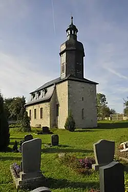 Die Dorfkirche befindet sich auf einer ebenen Anhöhe mit eingezäunten Gottesacker zentral im Dorf.