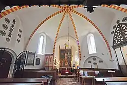 In der Apsis befindet sich der neugotische Altar mit Kreuzigungsszene. Am Übergang von Apsis zum Hauptraum steht die gemauerte Kanzel mit Evangelistenreliefs aus dem 17. Jahrhundert. An den Wänden hängen zinnerne Sargbeschläge mit Wappen der Patronatsfamilien aus dem 18. und 19. Jahrhundert, Kabinettscheiben von 1680 ergänzen die Ausstattung. Der sechsarmige Kronleuchter aus Messing, der vom Schlussstein des Gewölbes in den Kirchenraum herabhängt stammt aus dem 17. Jahrhundert. Die beiden bronzenen Leuchter beidseitig des Altars wurden 1698 von Adam Levin von Knuth gestiftet. Die Grabkapelle der Familie Knuth ist mit einer eichenen Holztür und der davor befindlichen kunstvollen schmiedeeisernen Gittertür von 1736 verschlossen. Die Glocke wurde 1709 von Adam Levin von Knuth und seiner Frau Cornelia gestiftet.[6]