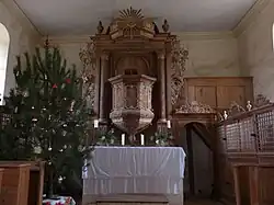 Im Kircheninneren befindet sich ein hölzerner Kanzelaltar mit reichem Schnitzwerk. Beidseits vor diesem an der Nord- und Südwand steht das separierte Patronatsgestühl. Das restliche Kirchengestühl ist schlicht. Über dem Eingang befindet sich die hölzerne Westempore. Auffällig ist, dass die gesamte hölzerne Kirchenausstattung der Dorfkirche (Kanzelaltar, Patronats- und weiteres Kirchengestühl, Empore) keinerlei Farbanstrich aufweist. Im Turm hängen zwei Glocken, die aus dem Mittelalter stammen könnten.