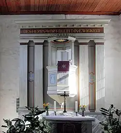 Der Kanzelaltar stammt wie auch die übrige Kirchenausstattung aus dem Jahr 1848. Er besteht aus je zwei Säulen, zwischen denen ein polygonaler Kanzelkorb eingelassen ist. Oberhalb ist ein achteckiger Schalldeckel. Darüber ist der Spruch aus dem 1. Brief des Petrus zu lesen: „Des Herrn Wort bleibt in Ewigkeit“ (1,25 ). Im Innern ist an der West- und Nordseite eine Empore. Die Sauer-Orgel aus dem Jahr 1963 wurde 1968 transloziert.