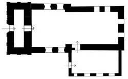 Das spitzbogige Westportal zeigt ein profiliertes Gewände aus Birnstabrippen. Im Anbau aus den 1950er Jahren befindet sich eine rechteckige Tür. Der Durchgang vom Gemeinderaum zum Chor dürfte vor dem Bau vermutlich das ursprüngliche Priesterportal gewesen sein. Der Anbau verfügt nach Süden über vier Fenster, drei Segmentbogenfenster mit Läden und ein Rundfenster. Zwei weitere Segmentbogenfenster befinden sich in der Ostwand des Chores, wobei die unteren 40 Zentimeter zugesetzt wurden. Über diesen sind zwei Schlitzfenster eingebracht. Auf der Nordseite befinden sich im Mauerwerk des Chores zwei unterschiedlich große, rechteckige Fenster, wobei das kleinere östliche nahezu quadratisch, während das westlichere hochrechteckig eingearbeitet wurde. Neben dem größeren Fenster erkennt man noch das Ziegelgewände eines älteren, vermauerten Fensters. Der Bogen dieses ist nicht erhalten. Im Kirchenschiff wurden auf der Nordseite zwei Korbbogenfenster eingearbeitet. Um diese finden sich wie um die nördlichen Rechteckfenster im Chor Faschen. In den Seitenwänden des Turmes befinden sich im ersten Geschoss jeweils schmale Spitzbogenfenster, die im oberen Teil zugesetzt wurden. Unterhalb der Fenster wurden jeweils zwei etwa zehn Zentimeter tiefe Blenden eingearbeitet. Neben dem Westportal befinden sich ebenfalls jeweils rechts und links zwei Blenden. Weiterhin zeigen sich auf der Westseite drei große Rundblenden zwischen Portal und Glockengeschoss. Im Glockengeschoss befinden sich jeweils zwei gekuppelte Schallöffnungen in Form von Segmentbögen unter einem großen Spitzbogen in der West- und in der Ostwand und jeweils eine derartige gekuppelte Schallöffnung auf der Nord- und der Südseite des Turms. Auf dem Turmdach sitzt seit 1996, nachdem der Dachreiter abgenommen werden musste, ein Aufsatz mit Turmkugel und Windfahne. An der Ostwand des Turmes kann man heute noch den Ansatz eines ursprünglich höheren und steileren Schiffsdaches erkennen. Heute besitzt er ein queres Walmdach. Seit dem Umbau nach dem Brand 1607 befinden sich das Kirchenschiff und der Chor unter einem einheitlichen Satteldach. Der später errichtete Anbau besitzt ein Pultdach, welches im Dach Satteldach des Schiffs und des Chores ausläuft. Auf das Pultdach wurde am östlichen Giebel ein Schornstein gemauert.[5]
