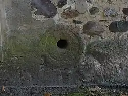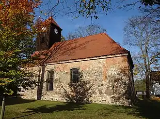 Ein auffälliges Detail ist ein eingemauerter slawischer Mühlstein mit einem Durchmesser von ca. 41 cm, der sich rechts unter der Eingangspforte am Westturm befindet. Er könnte in der Zeit vor der Reformation als Bestattungsurne für eine Reliquie gedient haben. In den Sockel der Kirche wurde er wohl bewusst integriert, um damit den Sieg des Christentums über das Heidentum zu symbolisieren. Rechts vom Mühlstein befindet sich ein Grabstein, der vermutlich aus Rüdersdorfer Muschelkalk besteht.