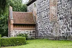 Der dendrochronologisch auf 1433d[1] datierte Westturm auf quadratischem Grundriss ist mit einem Pyramidendach geschlossen. Am Westturm befindet sich eine Einzeiger-Uhr. Um 1500 wurde eine Vorhalle aus Feld- und Backstein mit einem Blendengiebel im Süden angebaut.
