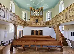 Die Orgel wird Johann Christian Rebhuhn zugeschrieben, der nach dem Kirchenbrand ein neues Werk im Jahr 1809 baute. Das Instrument verfügt über zehn Register auf einem Manual und Pedal ist und weitgehend erhalten; die Prospektpfeifen des Principal 4′ sind nicht mehr original. 2019–2023 restaurierte Dirk Schönefeld die Orgel mit Unterstützung des Thüringischen Landesamtes für Denkmalpflege und Archäologie.[2][3]