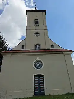 | Verputzte Saalkirche mit westlichem, quadratischem Dachturm. | |