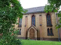 Das Bauwerk wurde im Wesentlichen aus gelblichem Mauerstein mit einer neugotischen Formensprache errichtet. Die Längsseiten des Kirchenschiffs sind in vier Abschnitte gegliedert, in denen im unteren Bereich jeweils zwei spitzbogenförmige, kleinere und gekuppelte Fenster eingebaut wurden. Darüber schließt sich jeweils ein ebenfalls spitzbogenförmiges, deutlich größeres Fenster an, das in seinem Innern nochmals die neugotische Form aufnimmt. Beide Öffnungen sind über eine aus orangefarbenen Mauersteinen gearbeitete Fasche optisch miteinander verbunden. Diese strenge Gliederung wird durch je vier, zweifach gestufte Strebepfeiler pro Seite nochmals verstärkt. An der südlichen Seite des Kirchenschiffs befindet sich in der Mitte an Stelle der Fenster ein nach vorne heraustretendes Portal mit einer aufwendig gearbeiteten hölzernen Tür und einem mit einem Fries verzierten Giebel. Den Übergang zur polygonalen Apsis erreichte Degner an der Nordseite mit einem rundbogenförmigen zweigeschossigen Turm mit einer Gutsherrenloge, während die Apsis mit einem Fünfachtelschluss wiederum streng geometrisch gegliedert ist. Im unteren Bereich befindet sich lediglich an der Ostseite der beiden Anbauten je ein Fenster, während sie in der Apsis nur im oberen Bereich in deutlich schlichterer Ausführung erstellt wurden. Der östliche Giebel ist ebenfalls aus hellgelbem Mauerwerk und einem Fries errichtet. Er schließt mit einem kleinen Turmaufsatz mit Kreuz ab. Der Westturm wird durch die ebenfalls orangefarbenen Lisenen an seinen Ecken gegliedert. Auf der Höhe der Traufe und dem Dachfirst sind schmale spitzbogenförmige Öffnungen eingearbeitet. Ein nach unten geöffneter rundbogenförmiger Fries schafft den Übergang zum Turmgeschoss, das mit einer Turmuhr und den darüber befindlichen Klangarkaden ausgestattet ist. Die Querseiten sind mit einem Kreuz aus gelblichen und orangefarbenen Ziegeln verziert. Daran schließt sich der Turmhelm mit Turmkugel und Wetterfahne an. Die Dächer sind mit schwarzen Ziegeln gedeckt.