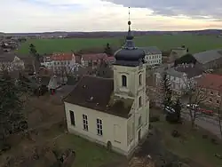 Die einschiffige Saalkirche wurde 1727/28 im Stil des Barock erbaut. Die Pläne stammen von J. Chr. Heins. Das mit einem Satteldach bedeckte Kirchenschiff hat im Osten einen dreiseitigen Abschluss. Nach Westen schließt sich der nicht schiffsbreite („eingezogene“) quadratische Turm mit geschweifter Haube an. Die Wetterfahne auf der Spitze zeigt die Jahreszahl 1728.
