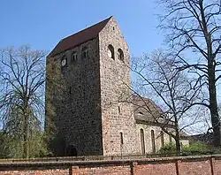 Die Dorfkirche ist ein Saalbau aus Feldsteinquadern aus der ersten Hälfte des 13. Jahrhunderts, mit eingezogenem Chor und mächtigem, leicht aus der Flucht der Schiffswände vortretendem Westquerturm. Sie wurde in den Jahren 1654–1663 wiederhergestellt, wobei vermutlich der Chor infolge der Zerstörungen mit Rechteckschluss anstelle einer Apsis wiederhergestellt wurde.[1] In den Jahren 1805/06 erfolgte eine Erneuerung des Chorschlusses, 1854 wurden die Fenster stichbogig erweitert und ein nördlicher Emporenaufgang am Chor angebaut. In den Jahren 1904/05 wurde eine eingreifende Renovierung vorgenommen.