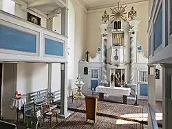 Das Kirchenschiff ist ein rechteckiger Saalbau mit zwei übereinanderliegenden umlaufenden Emporen. In dem von einer Stuckdecke überspannten Saal befindet sich ein Kanzelaltar im Stil des Rokoko mit ersten klassizistischen Anklängen. Über antikisierenden Säulen erscheint ein Tetragramm umgeben vom Strahlenkranz zwischen zwei Flammenvasen. Darunter auf dem Kanzeldeckel die Gesetzestafeln des Mose. Eine Taufe mit aufwändigen floralen Schnitzereien gehört zur Ausstattung. Der rechts an den Altaraufbau sich anschließende Rittergutsstand und die links sich anschließende Sakristei wurden Mitte des 20. Jahrhunderts entfernt.[2] In der nördlichen Empore hängt ein früheres Altarbild mit einer Darstellung von "Christus Brot und Wein segnend". Dabei handelt es sich um eine um 1857 entstandene Kopie des berühmten Gemäldes von Carlo Dolci aus der Dresdner Gemäldegalerie Alte Meister.