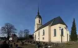 Ein ansteigender Weg mit Stützmauern vom Südosttor zur Kirche führt ebenfalls zum Kirchhof, der mit einer Linde in der Südostecke und einer Buche an der Nordostecke außerhalb des Kirchhofs bepflanzt ist. Ein Kriegerdenkmal aus Sandstein mit Inschrift erinnert an die im Ersten Weltkrieg Gefallenen.